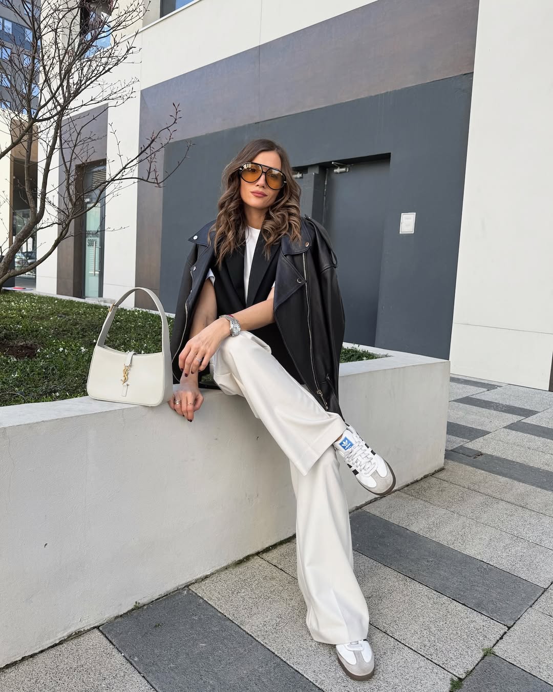 • The white shoulder bag features a YSL-style silhouette.