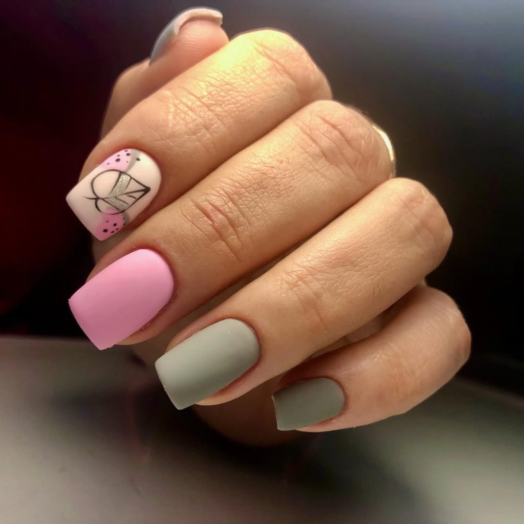 This combination of Pink and muted Green feels like spring in manicure form. The square shape keeps it structured, while the playful accent nail adds a little artistic flair. It’s Cute without being girly and fresh without trying too hard. There’s something about soft color blocking that instantly lifts your mood.