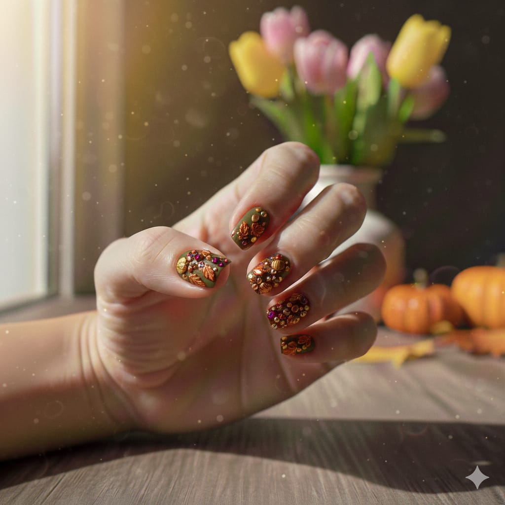 3D nail art with autumn elements like leaves, flowers, or gems adds dimension and glamour. Rhinestones, gold studs, and small decorative pieces make nails festive. 3D autumn nails are perfect for special events, weddings, or photo-ready looks. Pinterest users love sharing 3D fall nail ideas because they stand out in close-up shots.