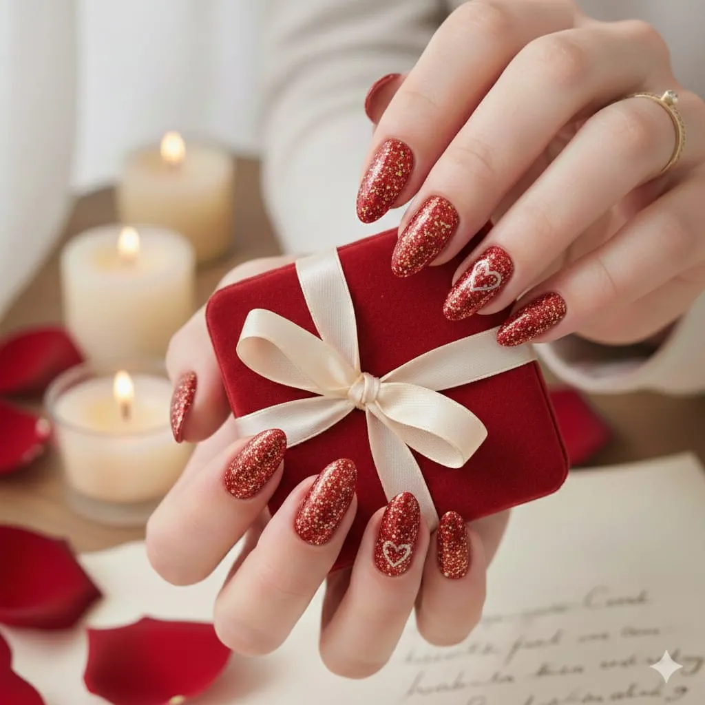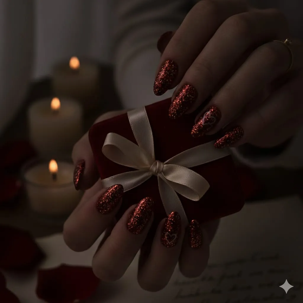 7. Glitter Cherry Valentine Nails