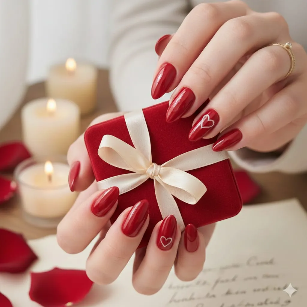 Deep burgundy or wine-red nails with cherry art give a bold, seductive Valentine vibe. Perfect for night looks and luxury aesthetics.