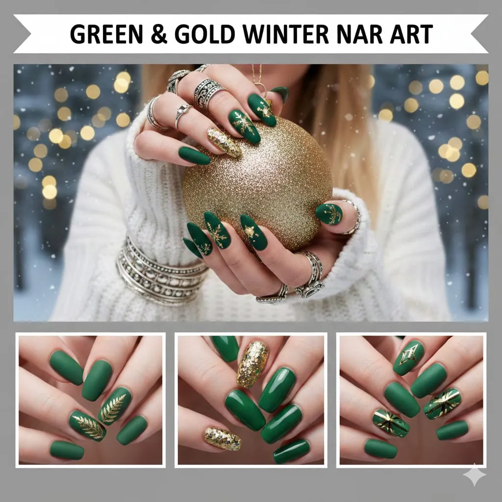 Green & Gold Winter Nail Art