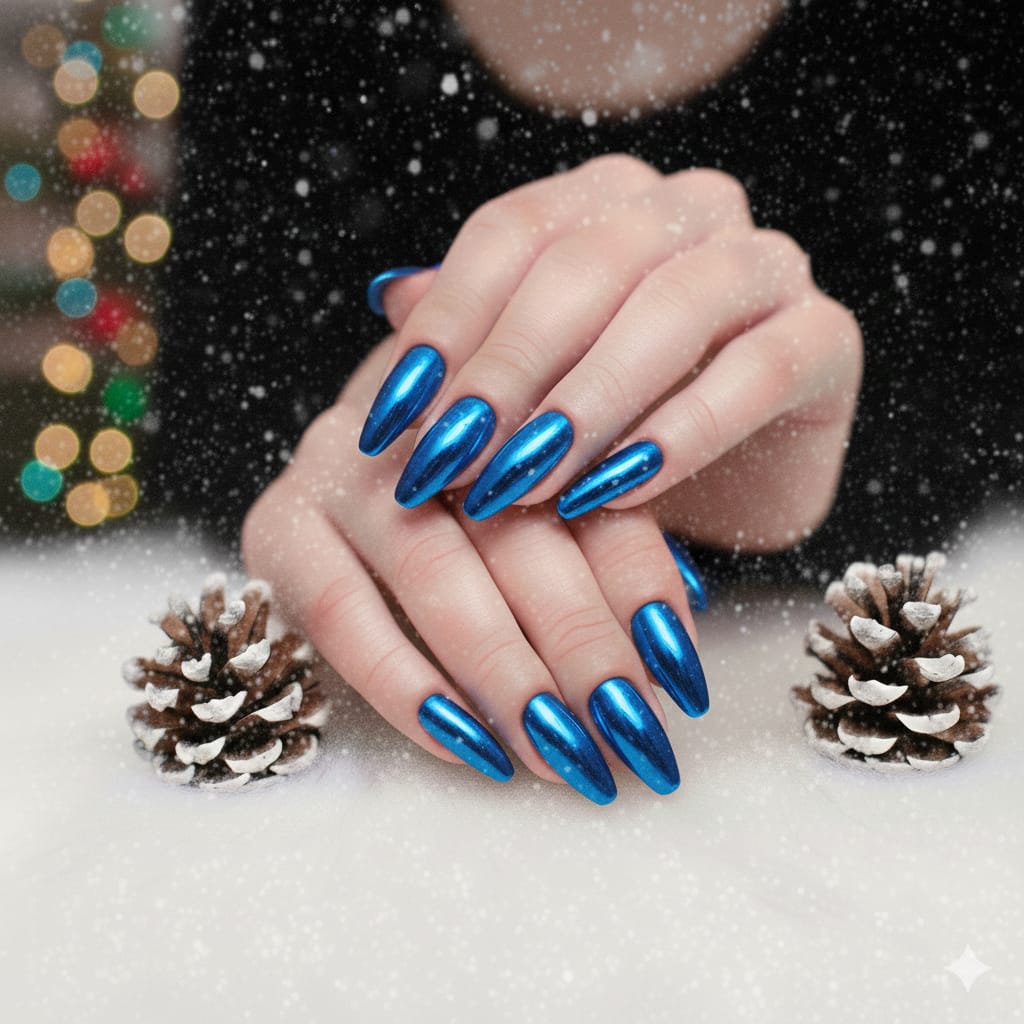 Blue aura nails give cool, calm, and relaxing vibes. Shades like sky blue, turquoise, or royal blue are blended to create an icy glow. These nails are popular in winter nail trends and look amazing on long coffin or almond shapes.