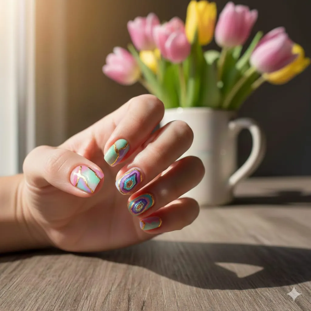 Marble or geode nail designs are bold and luxurious for spring. Soft pastel shades blended in marble or stone patterns create an elegant, artistic effect. Marble spring nails are perfect for statement looks and photoshoots. These designs are trending in 2026 for Pinterest-worthy nail inspiration.