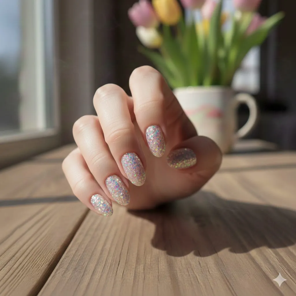 Glitter and shimmer add sparkle to spring nails. Soft iridescent glitter or holographic sparkles complement pastel and bright shades. Glittery spring nails are perfect for celebrations, photoshoots, and parties. Pinterest boards love eye-catching, sparkly spring designs that catch the sunlight.