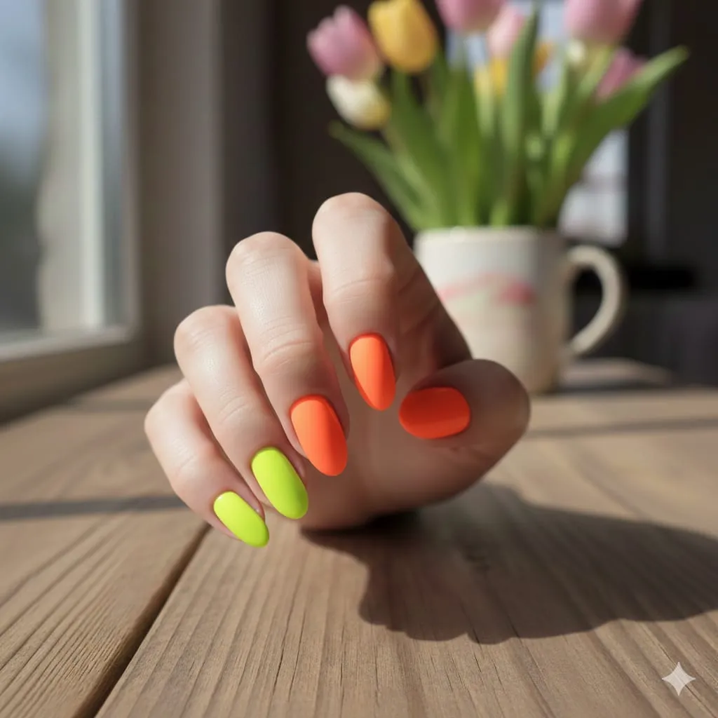 Bright colors and neon shades are trending for spring 2026. Shades like coral, neon pink, lime green, and bright yellow bring energy and fun. These nails are perfect for outdoor activities, festivals, and vacations. Neon spring nails create bold, eye-catching Pinterest content that stands out in feeds.